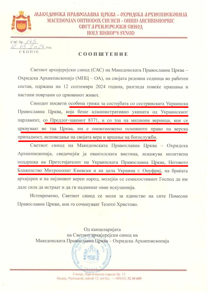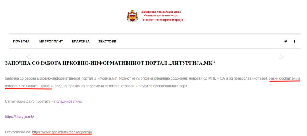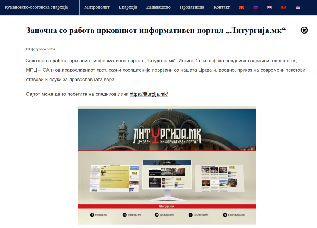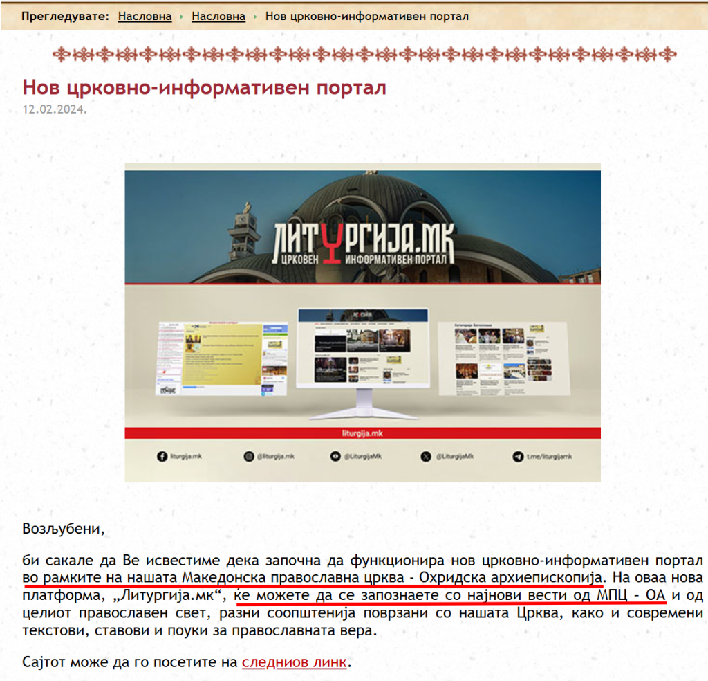 У квітні 2024 року Македонська православна церква – Охридська архієпископія (МПЦ ОА) дистанціювалася від низки церковних новинних порталів, зокрема Liturgija MK, заявивши, що офіційні реакції та заяви щодо МПЦ ОА поширюються виключно через Синод і уповноважену особу з питань зв’язків із громадськістю.