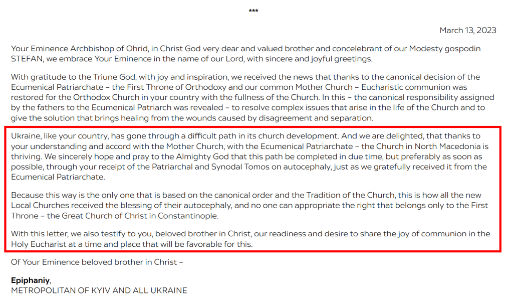 У цьому конкретному випадку використання формулювання «заборонити Церкву» (у македонському перекладі) має два підтексти: по-перше, йдеться про нібито заборону всієї УПЦ (московський патріархат в Україні – ред.) та всіх її 9 000–10 000 парафій одним судовим рішенням; по-друге – про непряму «заборону» всього православ’я в Україні. Насправді ж судова справа передусім стосувалася можливого припинення діяльності Київської митрополії УПЦ (московський патріархат в Україні – ред.).