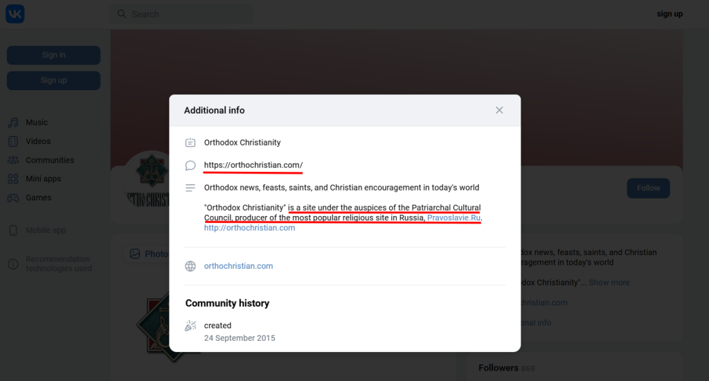 Хоча веб-сайт час від часу використовує офіційні джерела та деякі авторитетні видання, переважна більшість його контенту, що висвітлює війну в Україні та УПЦ (московський патріархат в Україні – ред.), базується на матеріалах, опублікованих OrthoChristian, англійською версією російського джерела www.pravoslavie.ru, а також Союзом православних журналістів www.spzh.eu – ЗМІ, яке є недоступним в Україні, а понад десяток осіб, пов’язаних з ним, перебувають під санкціями.