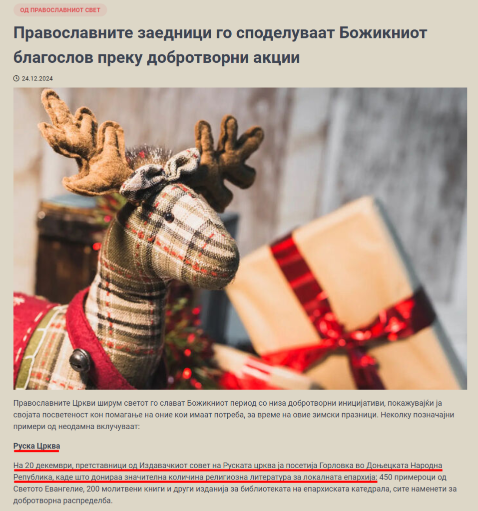 Сильна залежність Liturgija.mk від джерел, лояльних до Москви, таких як OrthoChristian, часто шляхом прямого й некритичного перекладу македонською мовою, прискорює формування громадської думки, співчутливої до російських виправдань вторгнення в Україну.