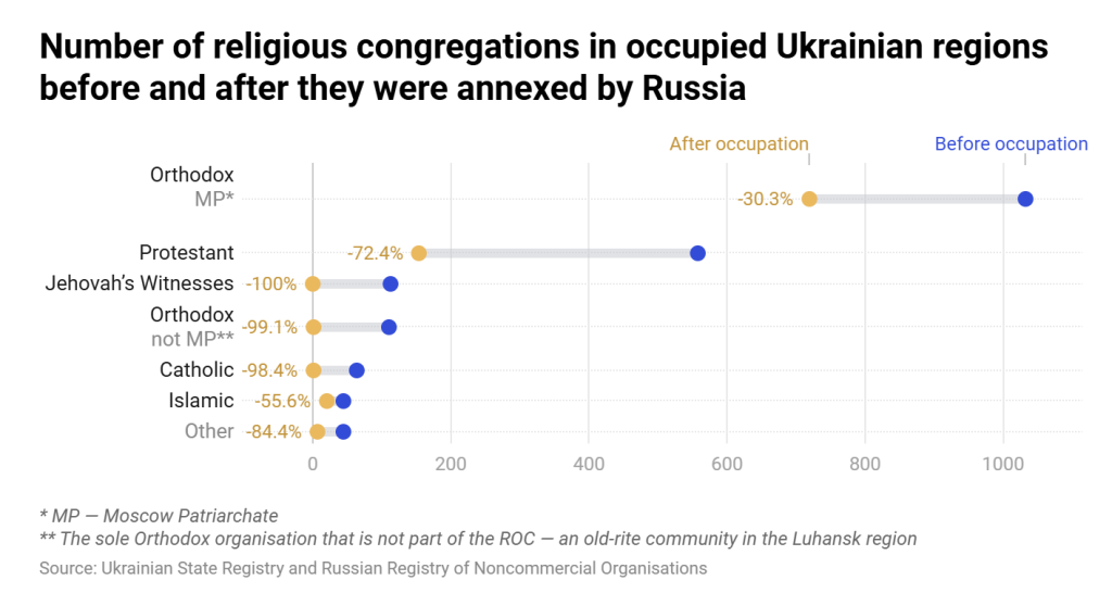 Розслідування «Нової газети», опубліковане у квітні, присвячене релігійним тенденціям у чотирьох регіонах України, окупованих Росією, засвідчило, що релігійний та громадський плюралізм там нині майже повністю відсутній. У ньому зазначається, що кількість протестантських громад скоротилася на 360%, тоді як кількість громад, пов’язаних з УПЦ (московський патріархат в Україні – ред.), – на 140%. Ще драматичнішою є ситуація з українськими католицькими громадами.