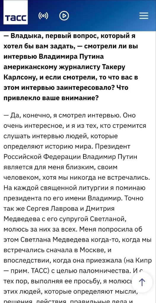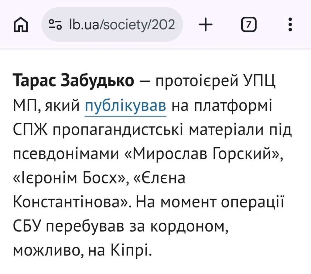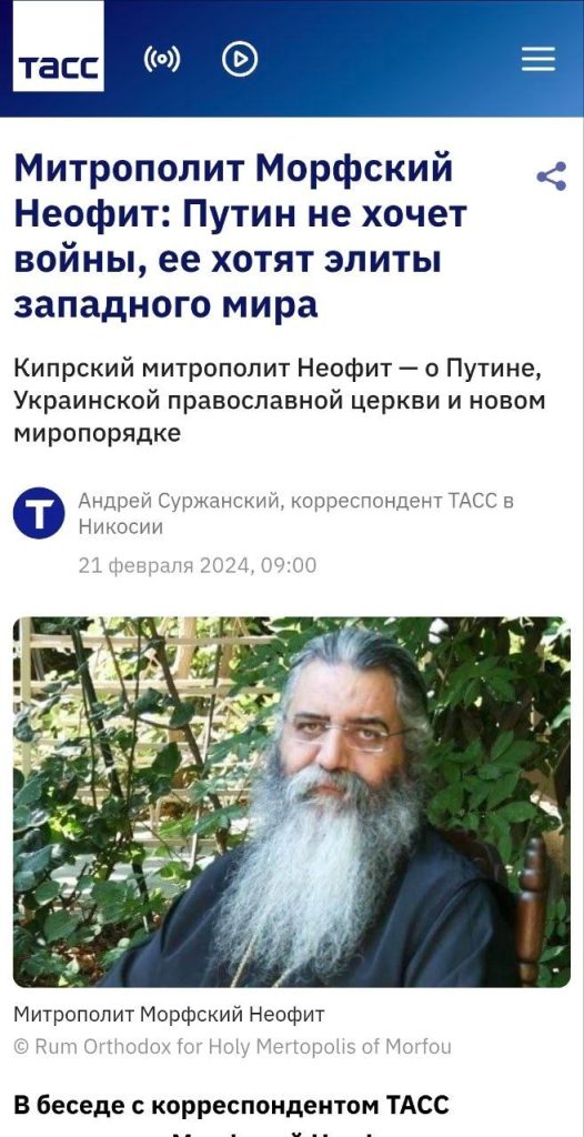 А тепер починається найцікавіше, адже з місця служіння Забудька випливає, що його єпархіальним керівником весь цей час був пафоський митрополит Тихік (Вріоніс), який, незважаючи на те, що Церква Кіпру визнала ПЦУ, виступає проти ПЦУ та проводить риторику щодо неї в стилі проросійських наративів.