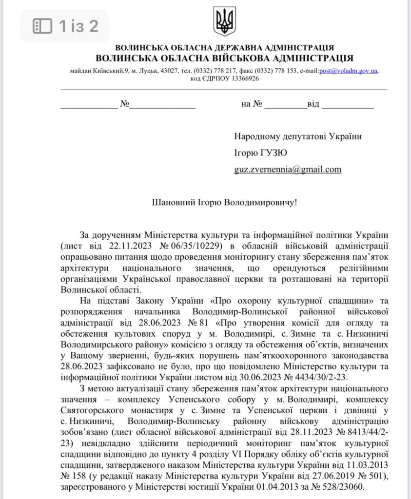 «Буг» нагадає, що у червні 2023 року 46 депутатів Верховної Ради, за ініціативою народного депутата Ігоря Гузя, звернулися до прем’єр-міністра Дениса Шмигаля з проханням перевірити три волинські святині, які перебувають в руках МПвУ – Зимненського і Низкиницького монастирів та Успенського собору у Володимирі.