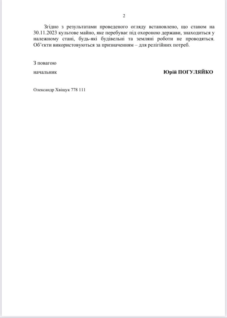Посадовці, які цього разу провели «моніторинг» культового майна 30-го листопада, також встановили, що воно «знаходиться у належному стані, будь-які будівельні та земляні роботи не проводяться. Обʼєкти використовуються за призначенням – для релігійних потреб».